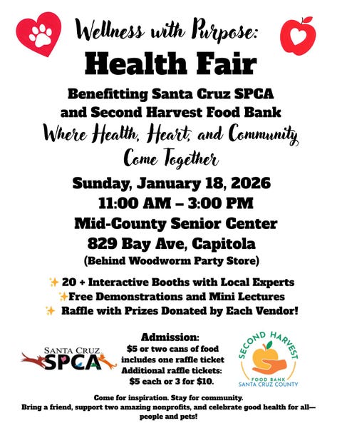 A New Year health fair focused on wellness and giving back. 🗓 Sunday, January 18, 2026 ⏰ 11:00 AM – 3:00 PM 📍 Mid-County Senior Center, Capitola A $5 donation at the door includes your first raffle ticket, with all proceeds benefiting pets and local families in need. Explore over 20 local wellness practitioners, enjoy demos, and enter a raffle benefiting the SPCA and Second Harvest Food Bank.
